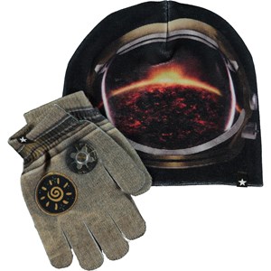 Matchande set med mössa och vantar i astronautmönster. Storlek S/M 3-6 år. Storlek M/L 7-12 år.