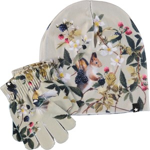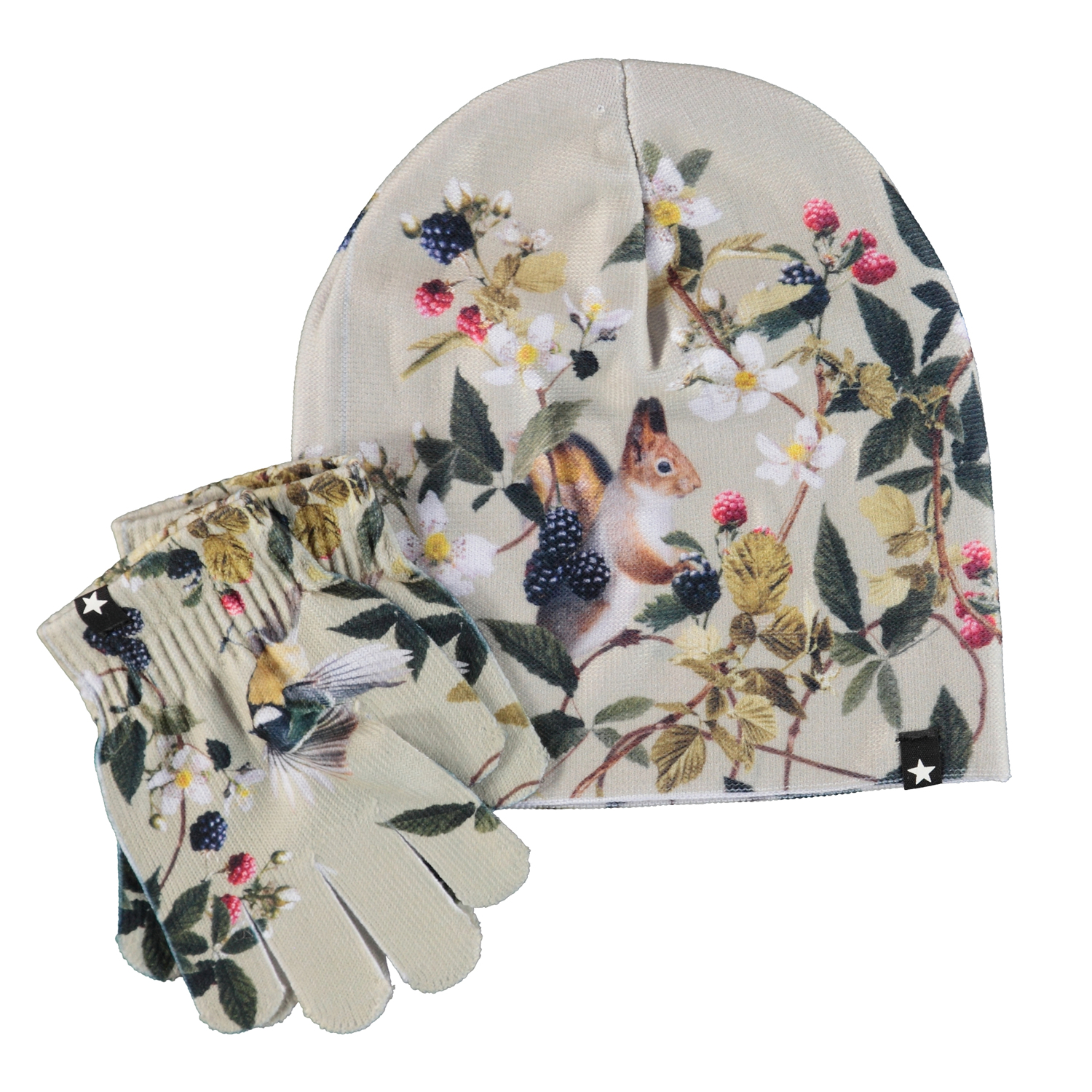 Matchande set med mössa och fingervantar med björnbärsrankor, blommor och en ekorre. S/M: 3-6 år och M/L: 7-12 år.