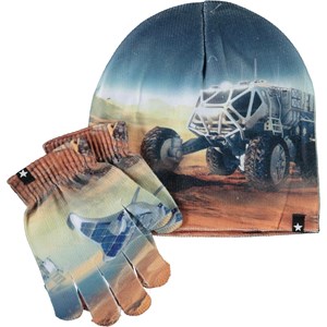 Matchande set med mössa och fingervantar med mönster från Mars. S/M: 3-6 år. M/L: 7-12 år.