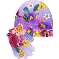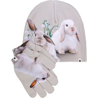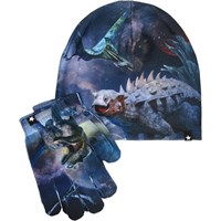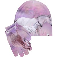 Set med mössa och fingervantar med isbjörnsmönster. Storlek S/M passar barn i åldrarna 3-6 år, och storlek M/L passar barn i åldrarna 7-12 år.