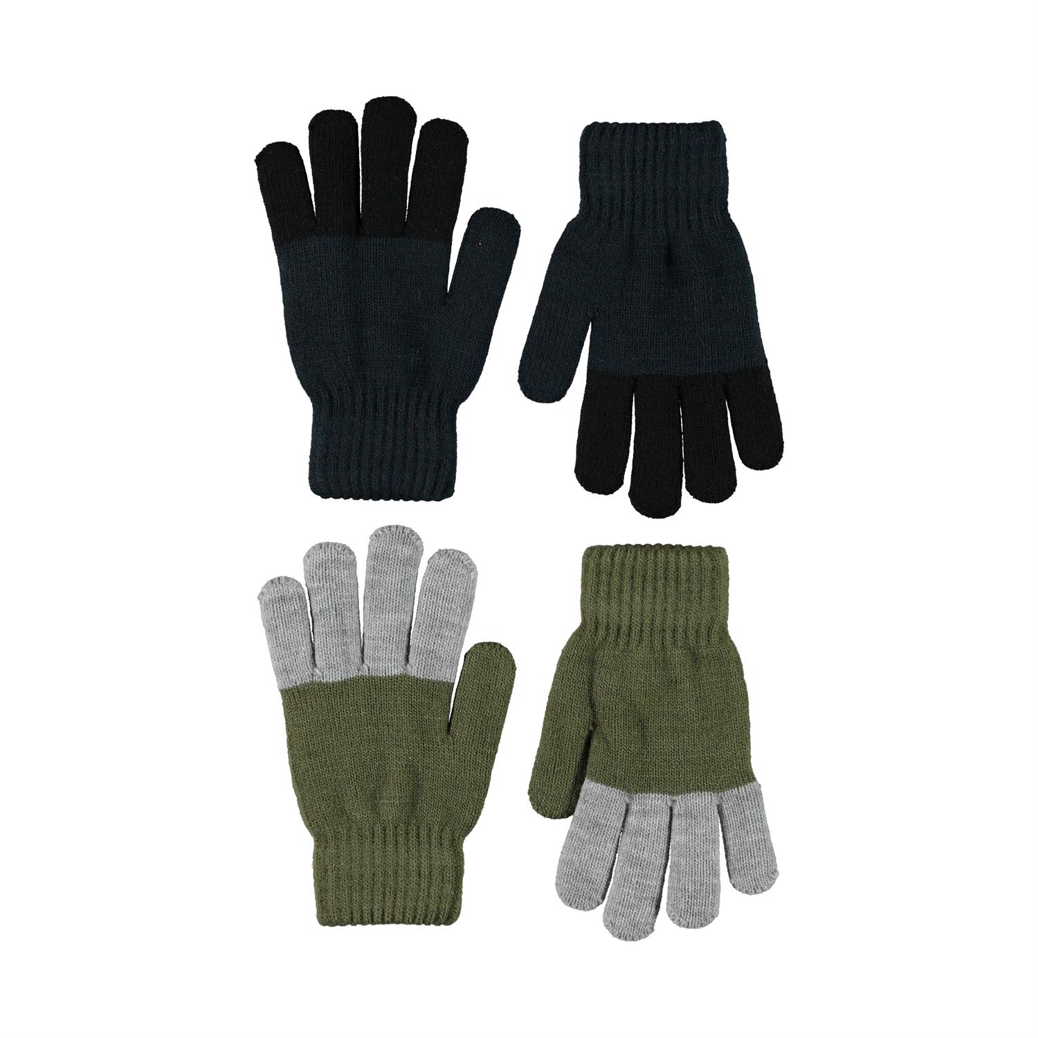 Två par fodrade fingervantar. Det ena paret är mörkblå med svarta fingrar och det andra gröna med ljusgrå fingrar.