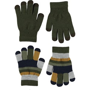 Två par stickade vantar där det ena paret är grönt med lite mörkare fingerspetsar, medan det andra är randigt i många färger.