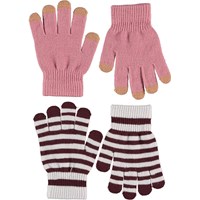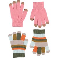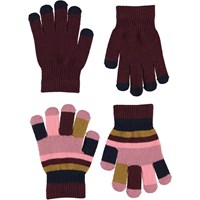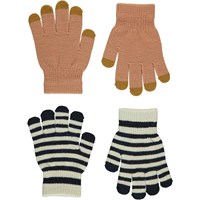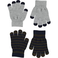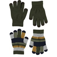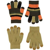 Två par stickade vantar där det ena paret är mörkblått med gröna fingerspetsar, medan det andra är randigt i två gula nyanser.