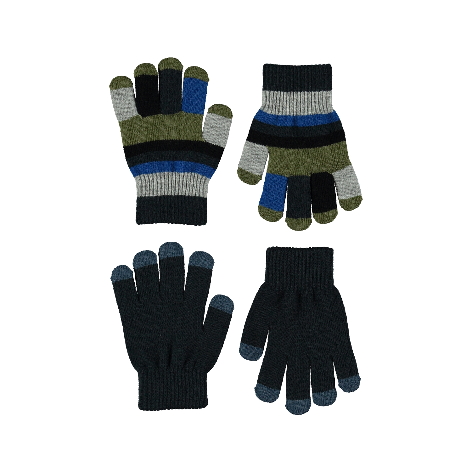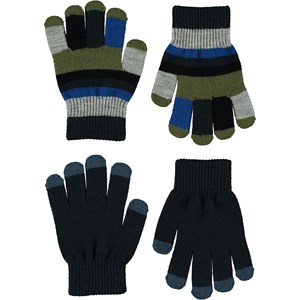 Två par stickade vantar. Det ena paret är mörkblått med ljusare fingerspetsar, medan det andra har breda ränder i blått, grönt och grått.