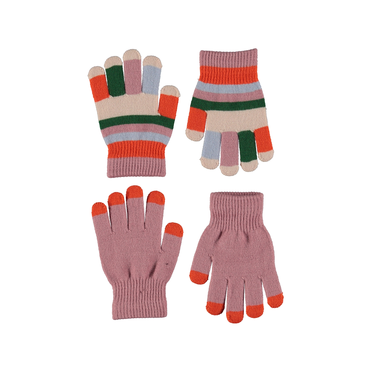 Två par stickade vantar. Det ena paret är rosa med orange fingerspetsar,medan det andra har breda ränder i pastellfärger.