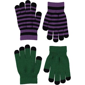 Två par stickade vantar. Det ena paret är grönt med svarta fingerspetsar, medan det andra är randigt i lila och svart.