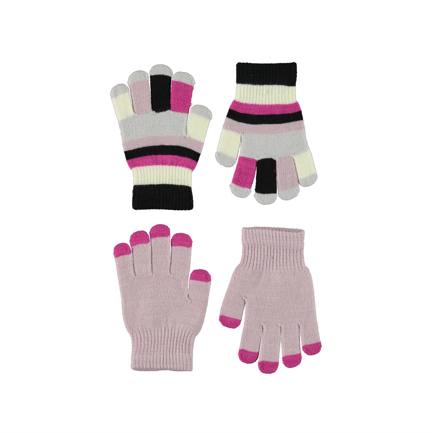 Två par fingervantar. Det ena paret är soft rosa med rosa fingertoppar, medan det andra är randigt.