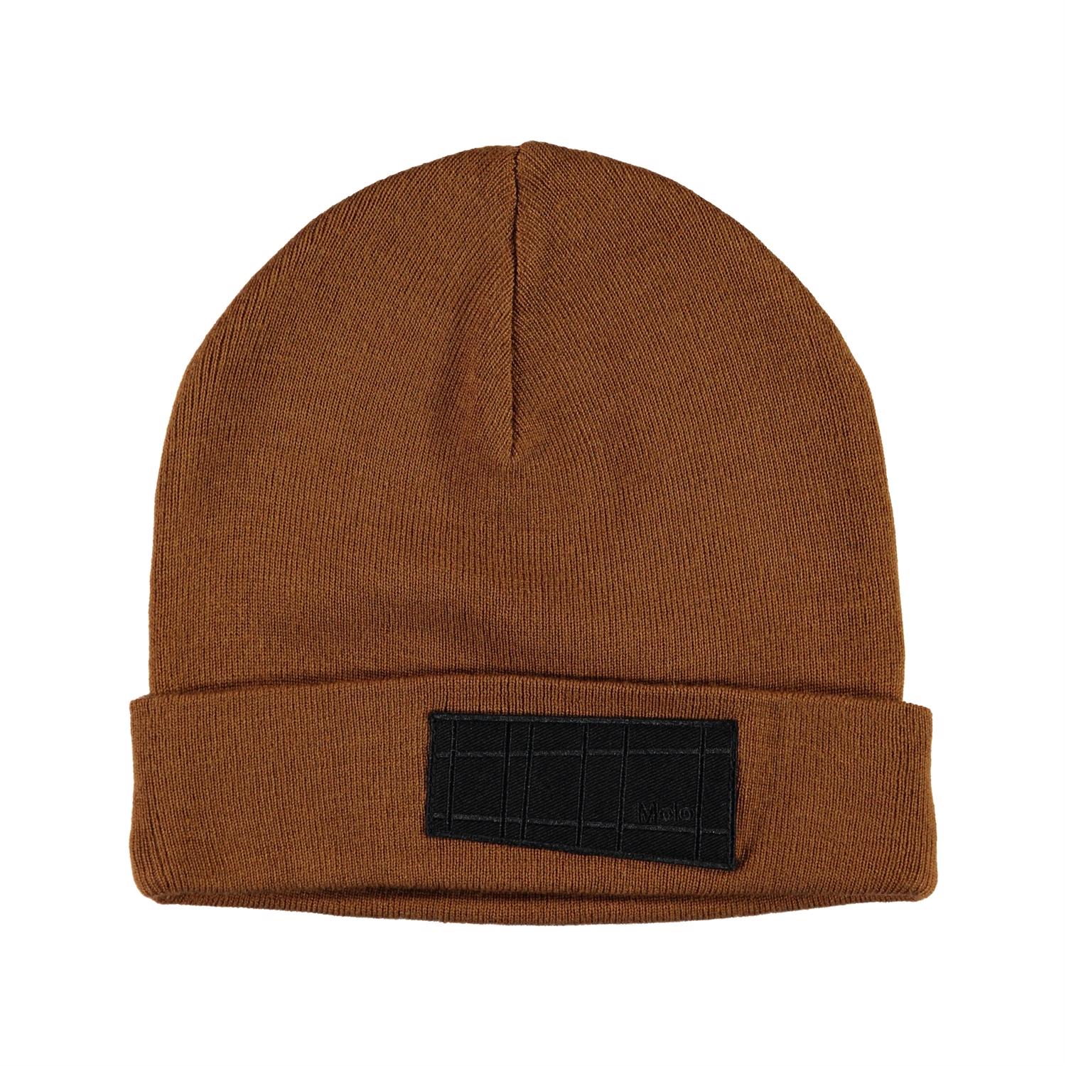 Brun mössa med uppvikbar kant och Molos nya etikett.