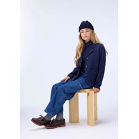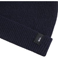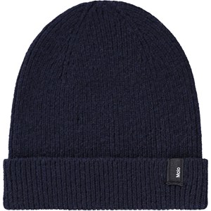 Mörkblå stickad mössa i en ullblandning med uppvik och Molo-logotyp.