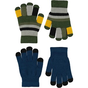 Två par fingervantar. Det ena paret är blåa med svarta fingertoppar och det andra randigt.