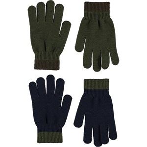 Två par stickade vantar där det ena paret är mörkblått med grön handled, medan det andra är grönt.