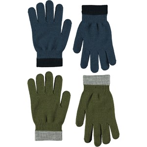 Två par stickade vantar. Det ena paret är grönt med grå kant vid handleden, medan det andra är blått.