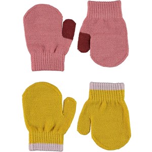 2 par babyvantar i rosa och gul. De rosa har röda tummar, medan de gula har en grå kant vid handleden.
