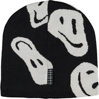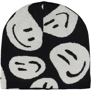 Svart mössa i ullmix med olika vita smileys.