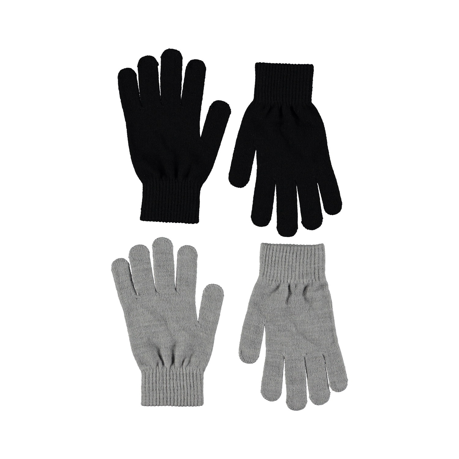 Två par stickade vantar. Det ena paret är grått, medan det andra är svart.