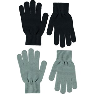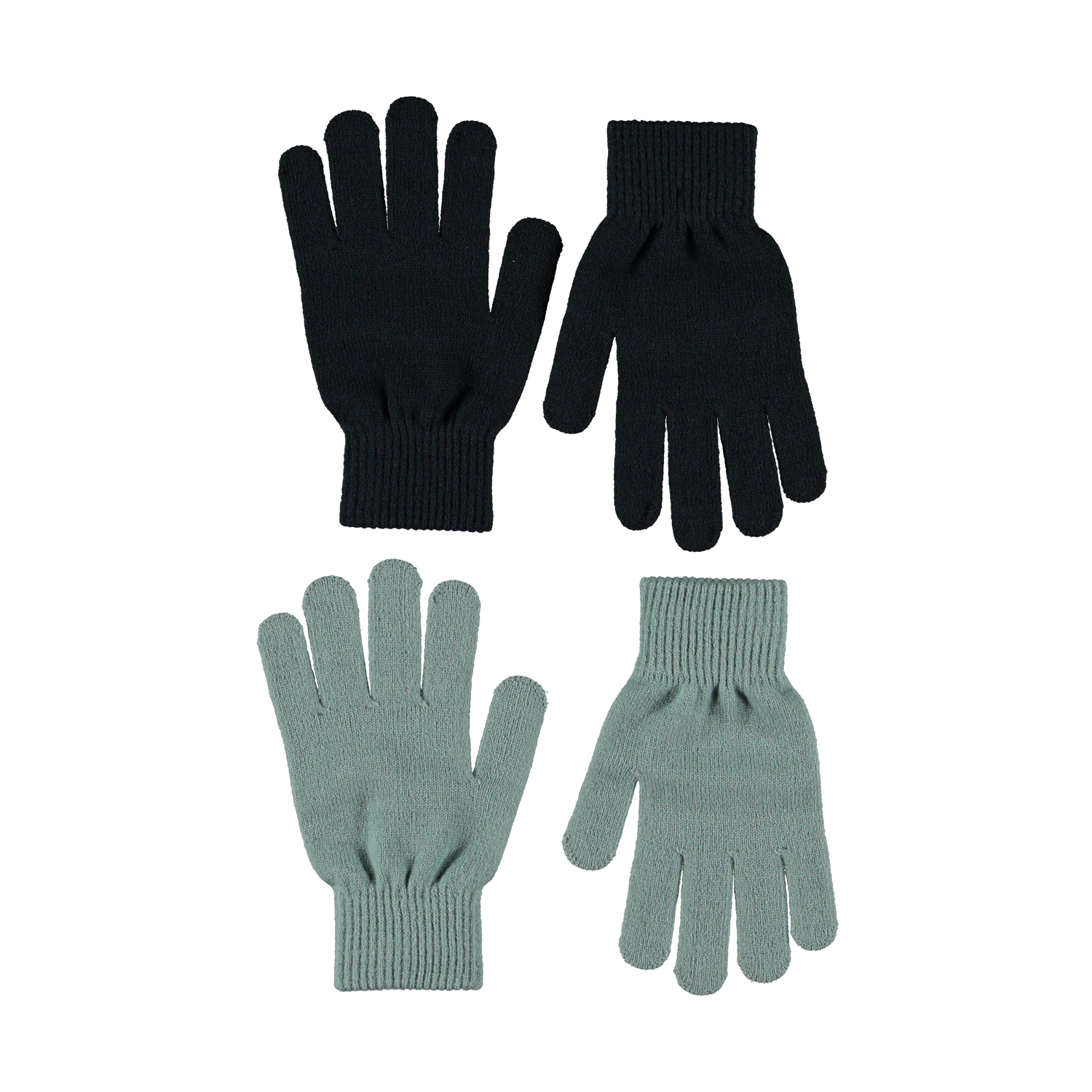 Två par stickade vantar. Det ena paret är mörkblått, medan det andra är ljusblått.