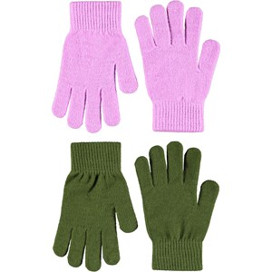 2-pack stickade vantar i grönt och rosa. Vantarna har en ribbstickad mudd som ger en bekväm passform och förhindrar att de glider av.