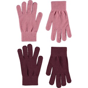 Två par stickade vantar där det ena paret är mörkrött, medan det andra är rosa.