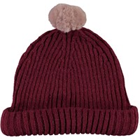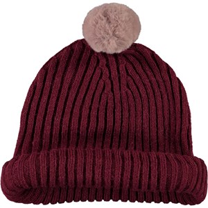 Mörkröd mössa med vikt kant och fuskpälsboll på toppen.