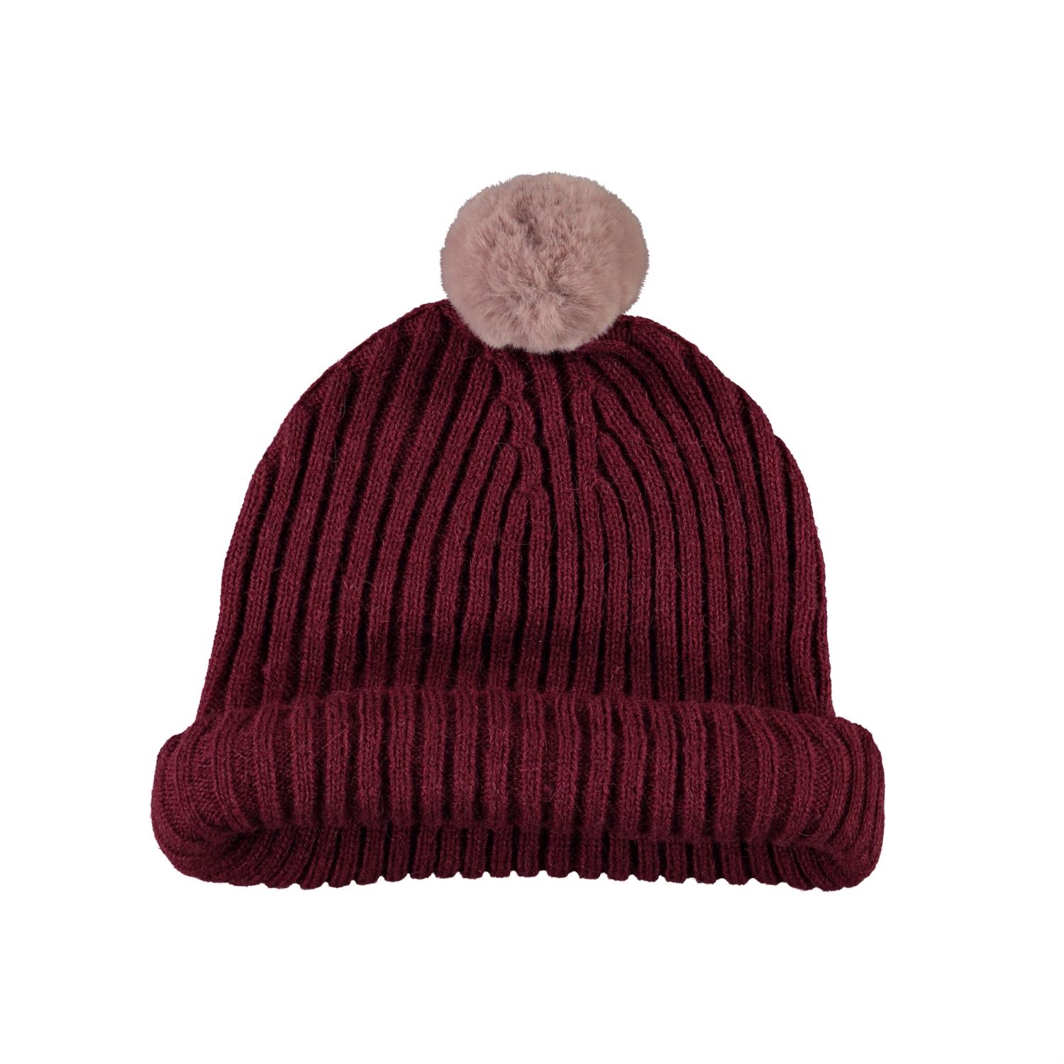 Mörkröd mössa med vikt kant och fuskpälsboll på toppen.