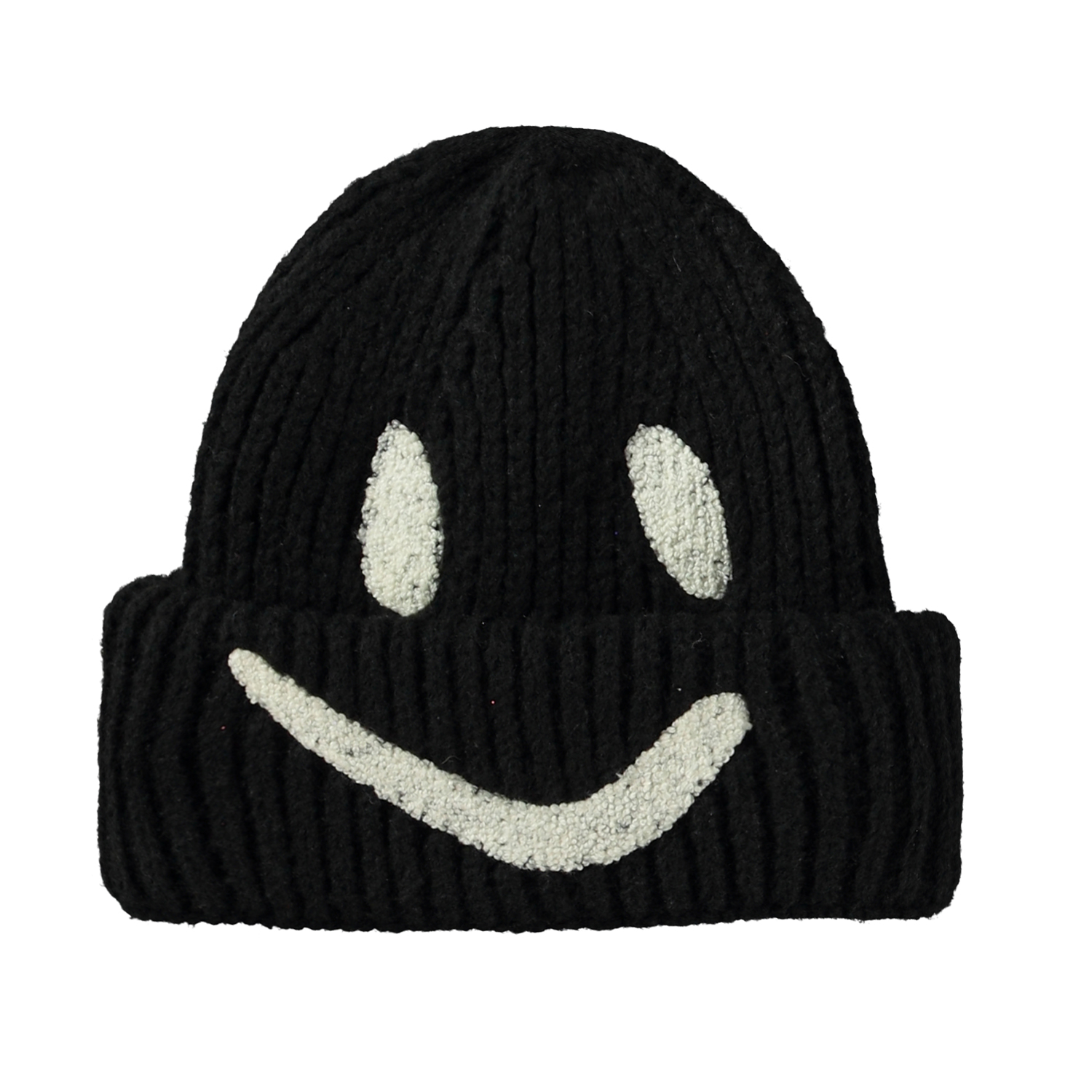 Ribbstickad mössa i svart med uppvik och broderad smiley i vitt.