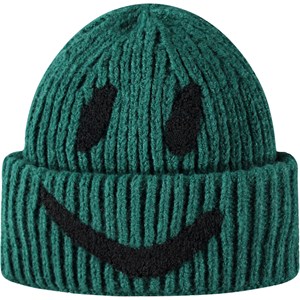 Ribbstickad mössa i grönt med uppvikt kant och broderad smiley i svart.