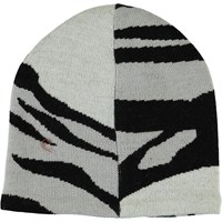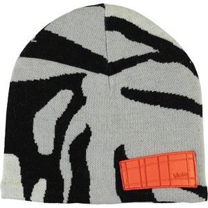 Grå mössa med ett svart tryck av tigerränder och Molos nya etikett i orange.