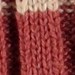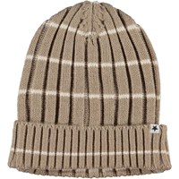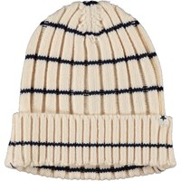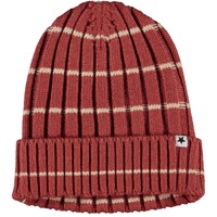Ribbstickad babymössa i röd med smala beige ränder. Mössan har uppvik nertill.