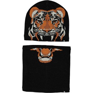 Svart mössa och tubhalsduk i ullmix med motiv av en tiger, som är fördelad på både mössan och tubhalsduken.