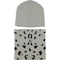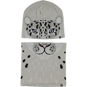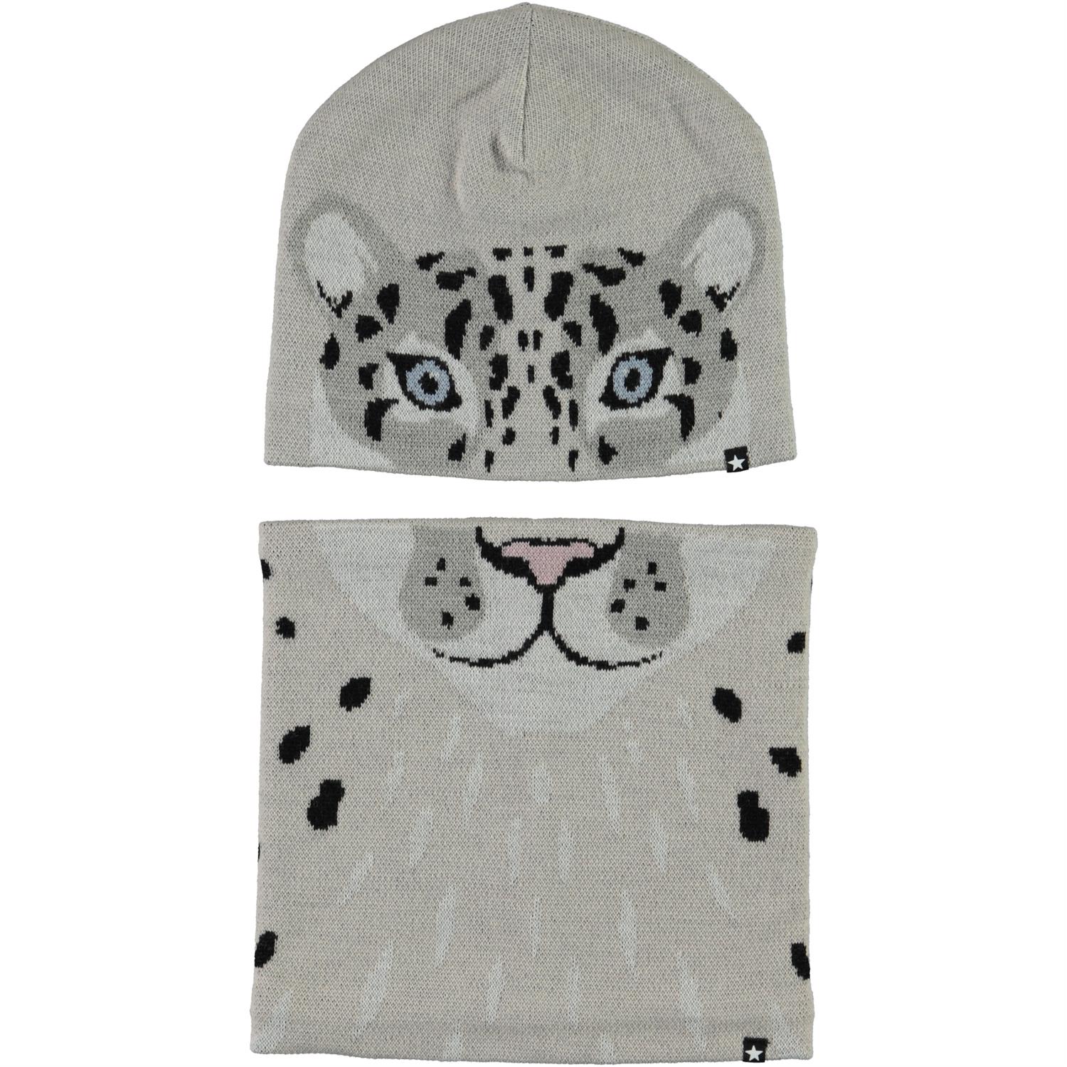 Grå mössa och tubhalsduk i ullmix med motiv av en snöleopard, som är fördelat på både mössan och tubhalsduken.