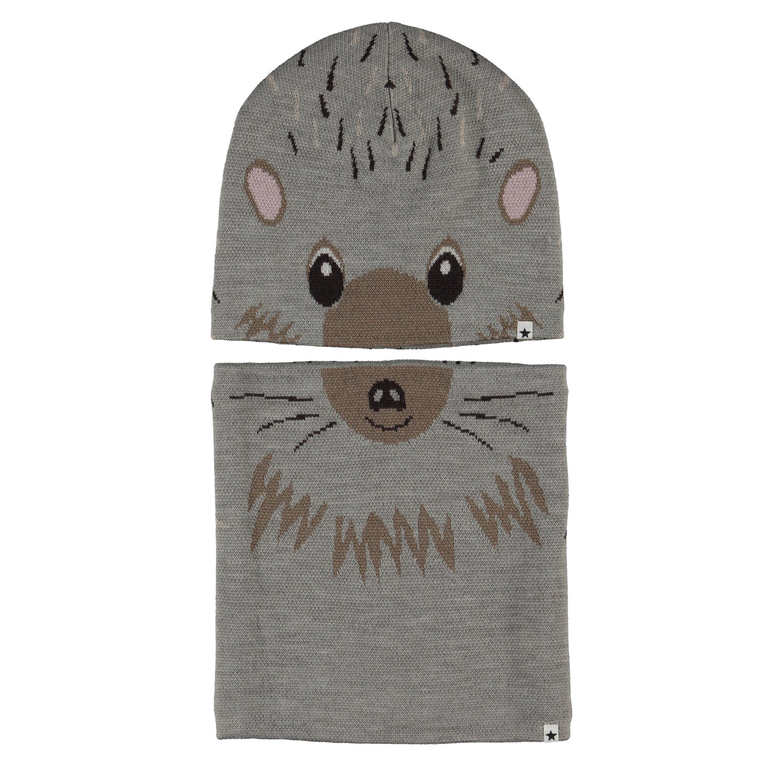 Grå mössa och halstub i ullmix med motiv av en söt igelkott, som är fördelad på både mössa och halstub.
