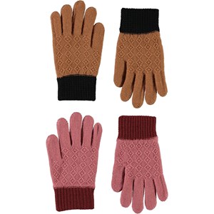 Två par fingervantar med ett fint stickat mönster på ovansidan, Det ena paret är ljusbrunt och det andra svart.