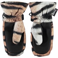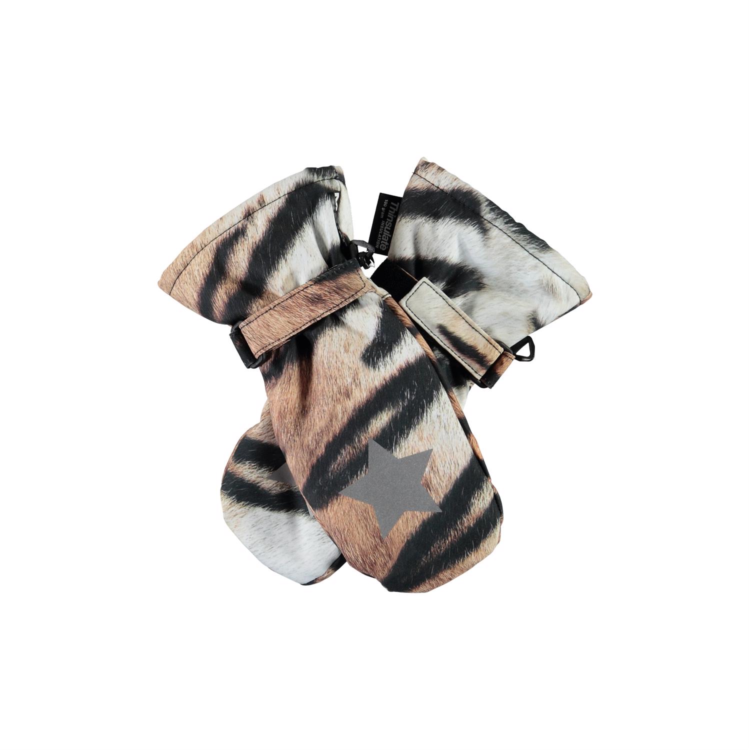 Tigermönstrade, vattentäta vantar med 3M™ Thinsulate™ isolering, som andas. Vantarna har stjärnreflexer framtill, samt en elastisk, justerbar kant vid handleden. Produkten har en vattenavvisande PFC-fri impregnering (innehåller exempelvis inte PFOS, PFOA och liknande). Vattenpelare: 10.000 mm. Andningsförmåga: 8.000 g/m2/24t.