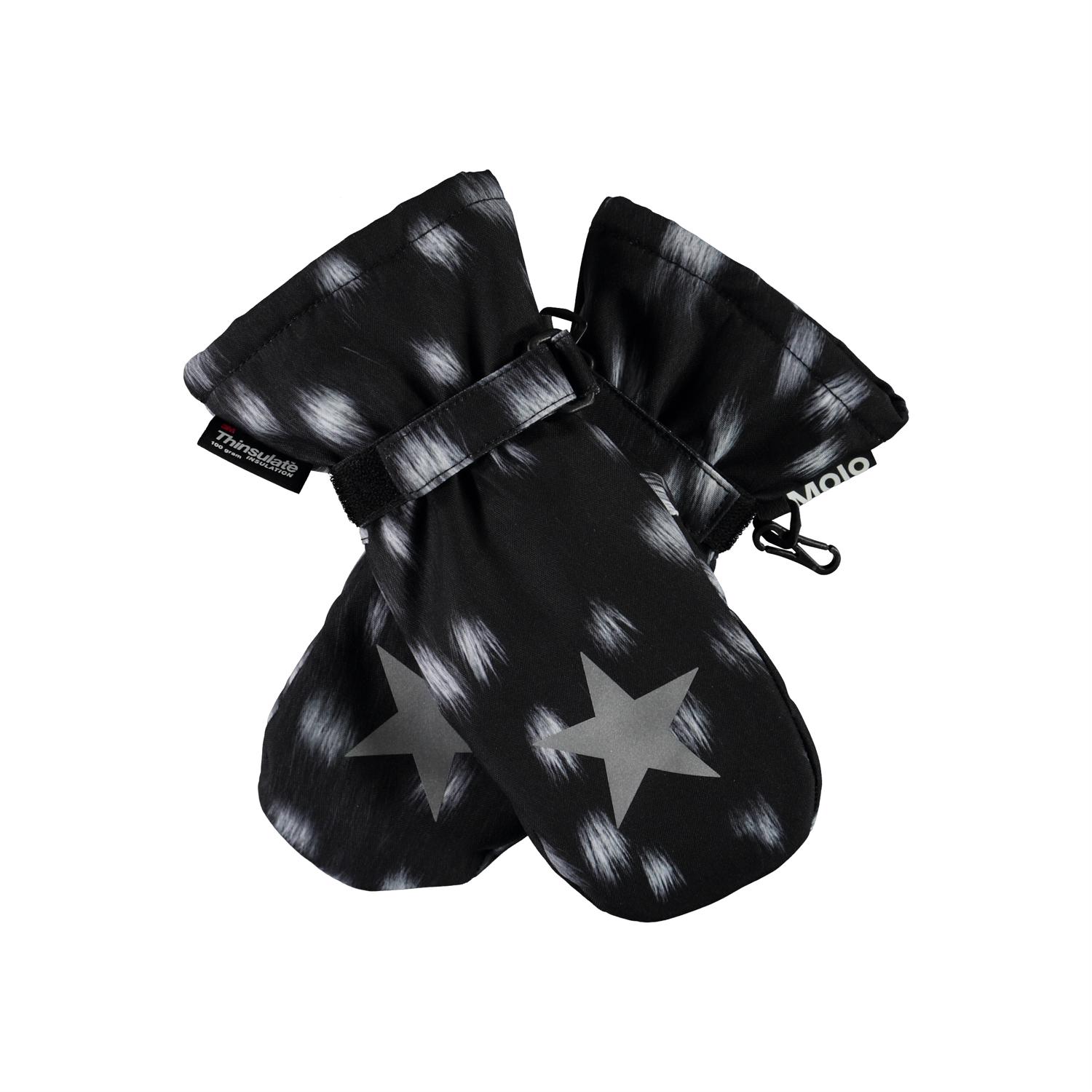 Vattentäta vantar med bra andningsförmåga och 3M Thinsulate isolering. Vantarna är svarta med vita fläckar, har en stjärnreflex på ovansidan samt gummiband och justerbar velcro vid handleden. Yttermaterialet är 51% återvunnet, tillverkat av återvunnen polyester. Vantarna har en vattenavvisande PFC-fri impregnering (innehåller t.ex. inte PFOS, PFOA och liknande). Vattenpelare: 10.000 mm. Andningsförmåga: 8.000 g/m2/24t.
