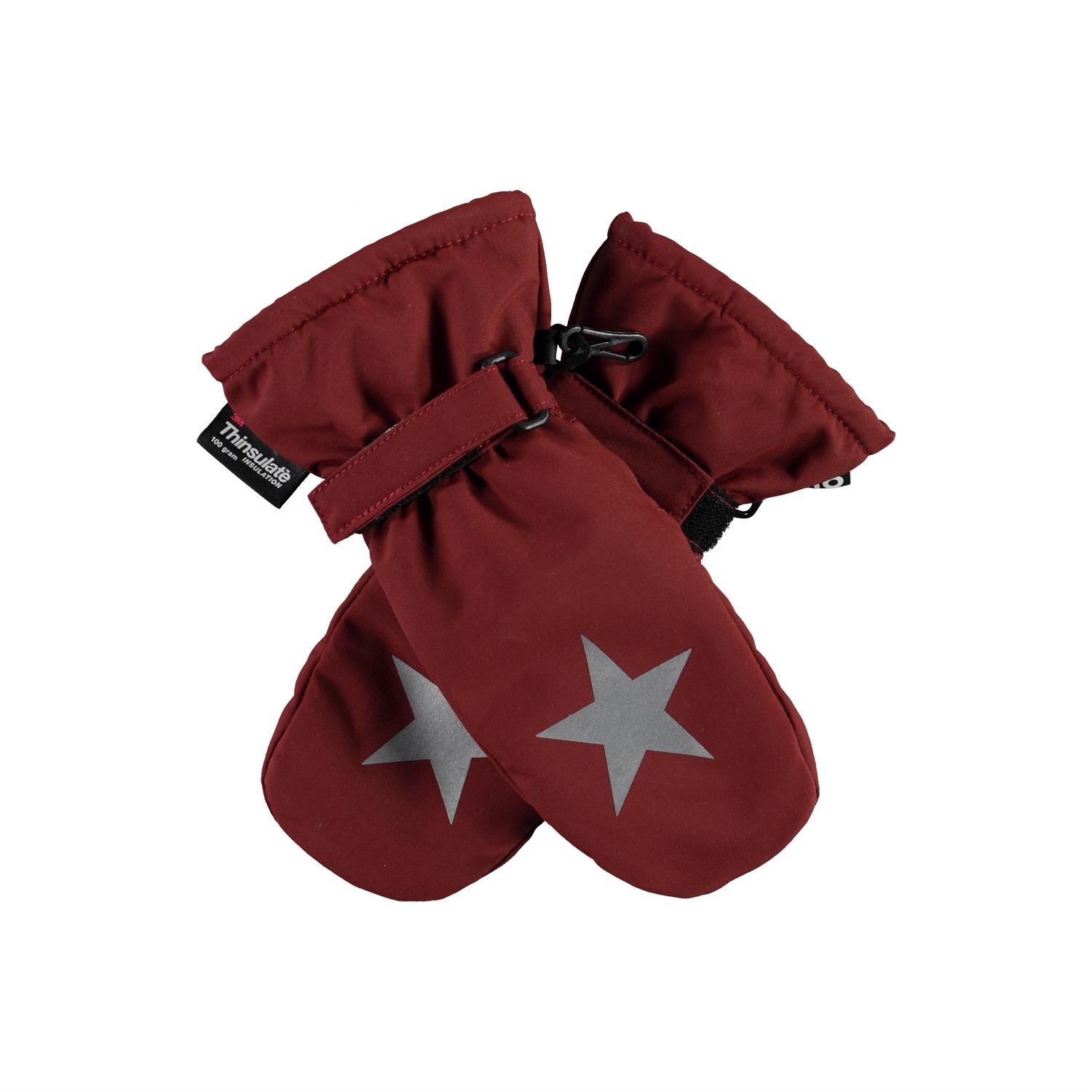 Vattentäta vantar med bra andningsförmåga och 3M Thinsulate isolering. Vantarna är mörkröda, har en stjärnreflex på ovansidan samt gummiband och justerbar velcro vid handleden. Yttermaterialet är 51% återvunnet, tillverkat av återvunnen polyester. Vantarna har en vattenavvisande PFC-fri impregnering (innehåller t.ex. inte PFOS, PFOA och liknande). Vattenpelare: 10.000 mm. Andningsförmåga: 8.000 g/m2/24t.