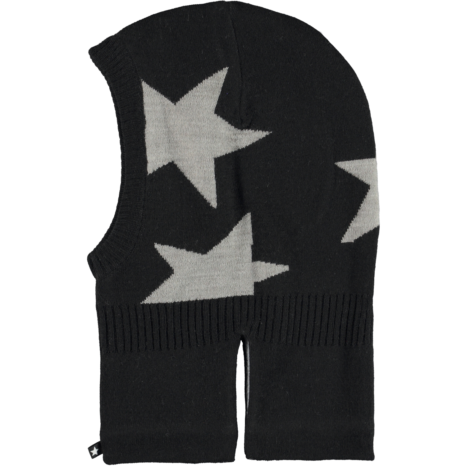 Svart balaklava i en mjuk ullmix med instickade sjtärnor och mjukt fleecefoder invändigt. Mössan har snitt vid halsen, så att mössan lägger sig bättre över bröst och axlar.