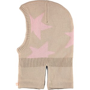 Beige balaklava i en mjuk ullmix med instickade rosa sjtärnor och mjukt fleecefoder invändigt. Mössan har snitt vid halsen, så att mössan lägger sig bättre över bröst och axlar.