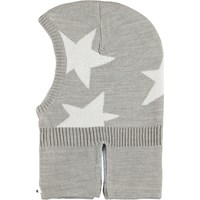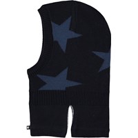 Svart balaklava med instickade stjärnor. Mössan är tillverkad i en mjuk ullmix och är fodrad med mjukt fleecefoder invändigt. Dessutom har balaklavan slitsar vid halsen, så den lägger sig bättre över bröst och axlar.