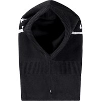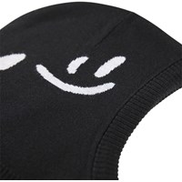 Svart balaklava med vita smileys. Balaklavan har slitsar på sidan av nacken så den passar bra över bröstet och axlarna. Tillverkad i en mjuk ullblandning och fodrad med mjukt fleecefoder.
