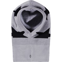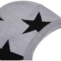 Grå balaklava med svarta stjärnor. Balaklavan har slitsar på sidan av nacken så den passar bra över bröstet och axlarna. Tillverkad i en mjuk ullblandning och fodrad med mjukt fleecefoder.