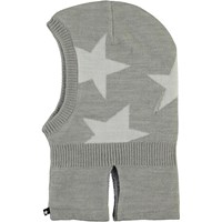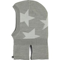 Grå balaclava mössa i mjuk ullmix med kontrastfärgade stjärnor. Mössan har ett mjukt fleecefoder och slits vid halsen, så att den sitter bättre över bröst och axlar.