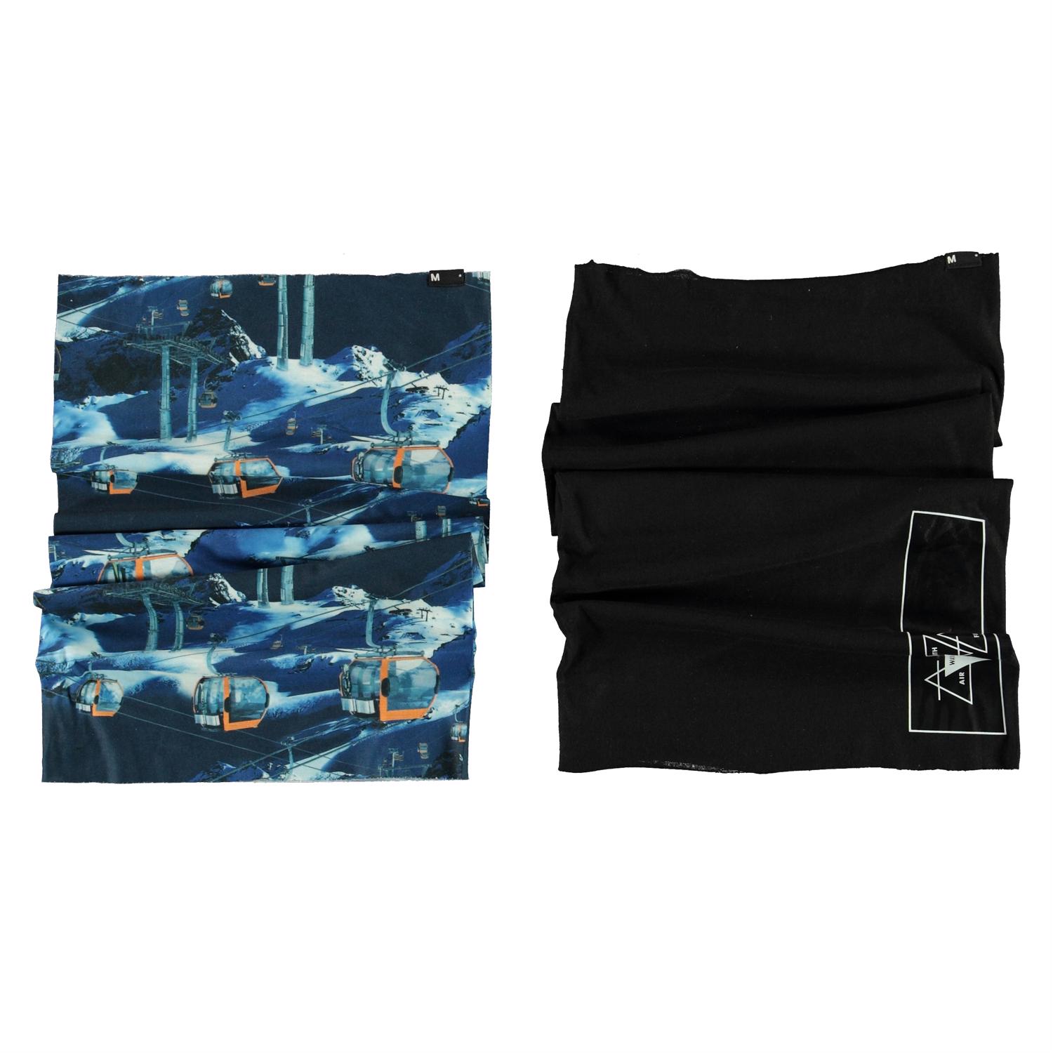 2 stk halskragar som kan användas året runt på många olika sätt. Den ena är blå med skidliftar och den andra svart. Halskragen kan användas runt halsen eller dras upp över öronen.