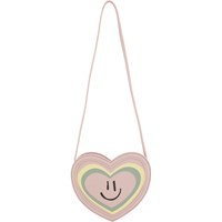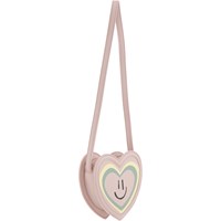 Axelremsväska i rosa som ärf formad som ett hjärta med en smiley framtill. Axelremmen kan justeras.