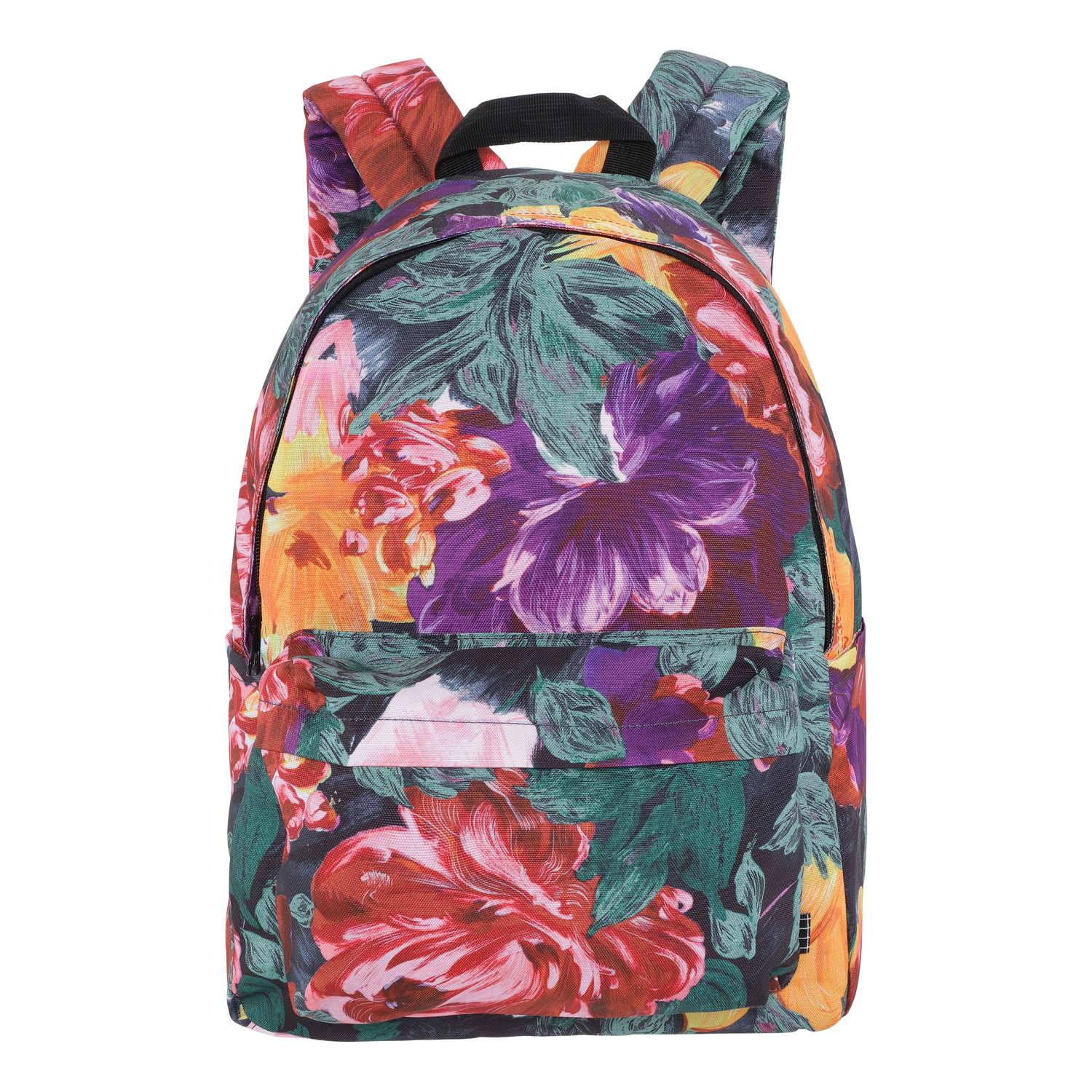 Rygsæk med farverigt blomster print. Rygsækken har masser af plads til bøger, hæfter, penalhus, madkasse og en polstret lomme, ideel til en bærbar computer eller tablet. Derudover har den en lynlåslomme på fronten, flaskelommer på begge sider, vatteret ryg og skulderstropper samt en justerbar brystrem, der hjælper til at fordele vægten jævnt. Dimensioner: 30 x 17 x 42. Volumen: 21L.