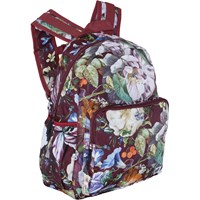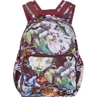 Rymlig ryggsäck med fina blommor. Ryggsäckens material är tillverkat av återvunnen polyester. Ryggsäcken har en utvändig ficka med dragkedja, fickor i båda sidor för exempelvis vattenflaska, vadderad rygg, hank och justerbara remmar. Ryggsäcken mäter ca. 18 cm på bredden och ca. 37 cm på höjden. Denna Molo produkt är återvunnen och tillverkad av återvunnen polyester, som tillverkas av använda plastflaskor och annat restavfall. Produktionen av återvunnen polyester kräver betydligt färre ressurser och ger mindre CO2 utsläpp, därför är Molo´s återvunna ryggsäckar det hållbara valet.