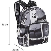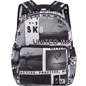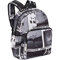 Rymlig ryggsäck i svart/vit med coolt mönster och text med skate- referenser. Ryggsäcken har ett utvändigt fack med dragkedja, fack i båda sidor till exempelvis en vattenflaska, vadderad rygg, handtag, justerbara axelband och invändigt fack.