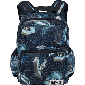 Rymlig ryggsäck med tryck av en tidsmaskin. Ryggsäcksmaterialet är tillverkat av återvunnen polyester. Ryggsäcken har en yttre framficka med blixtlås, ett 'M-3' märke, fickor på båda sidor, fodrad rygg, rem för upphängning och justerbara axelremmar.