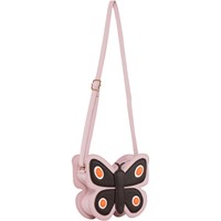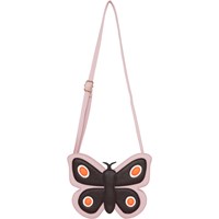 Rosa och svart axelremsväska med justerbar axelrem och en söt fjärilsdesign på framsidan.