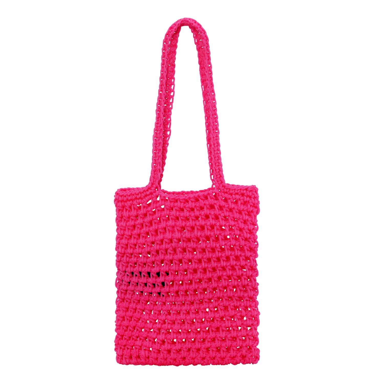 Liten, rosa axelväska, virkad av robust polyestergarn. Väskan är ofodrad och har en öppen topp med axelrem. Mäter 21 cm i bredd och 25 cm i höjd.