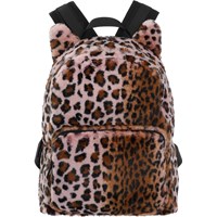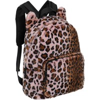 Rymlig fuskpälsryggsäck i rosa leopardmönster. Ryggsäcken har ett utvändigt fack med dragkedja och justerbar axelremmar.